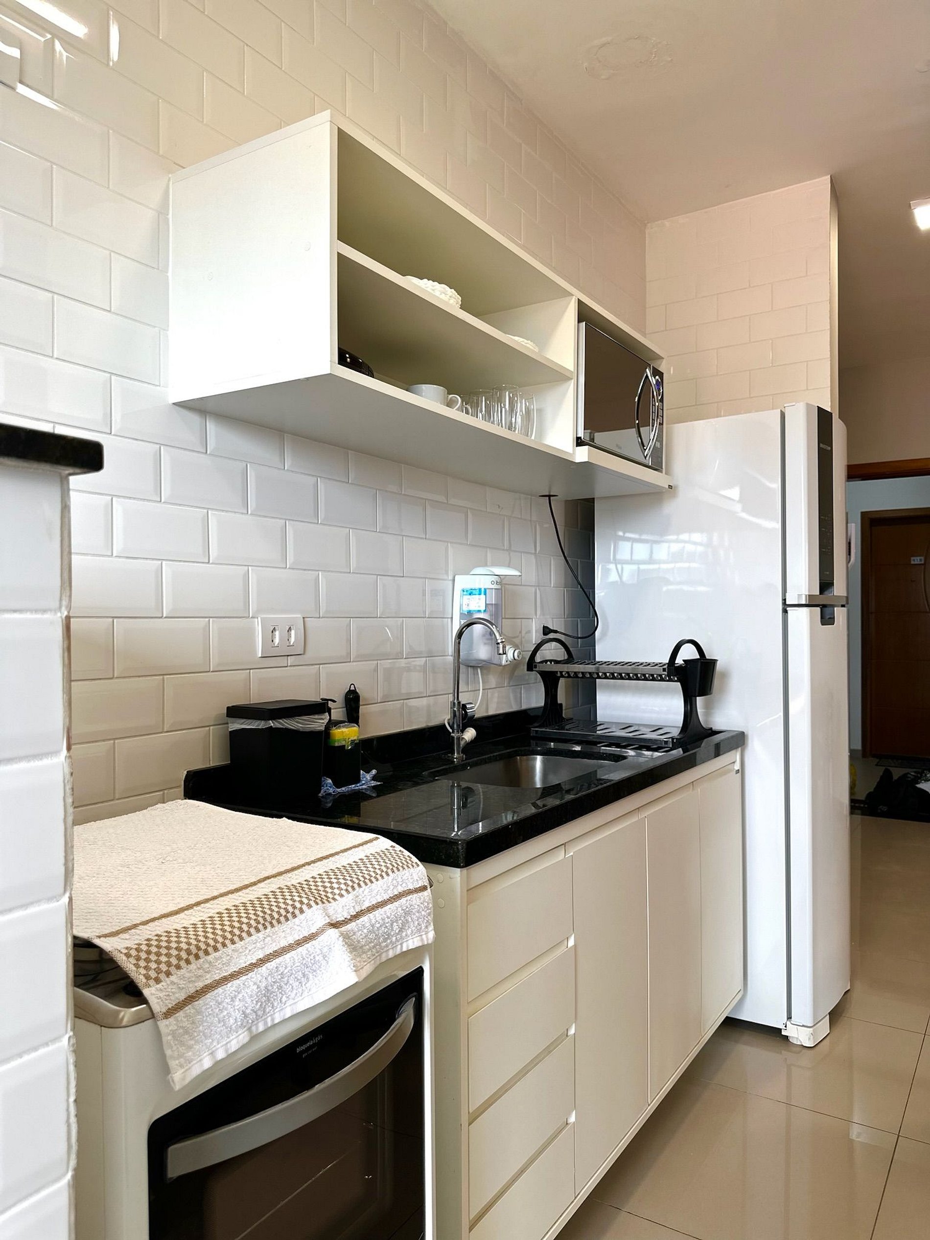 Cozinha totalmente equipada com fogão, geladeira, microondas, liquidificador, sanduicheira;