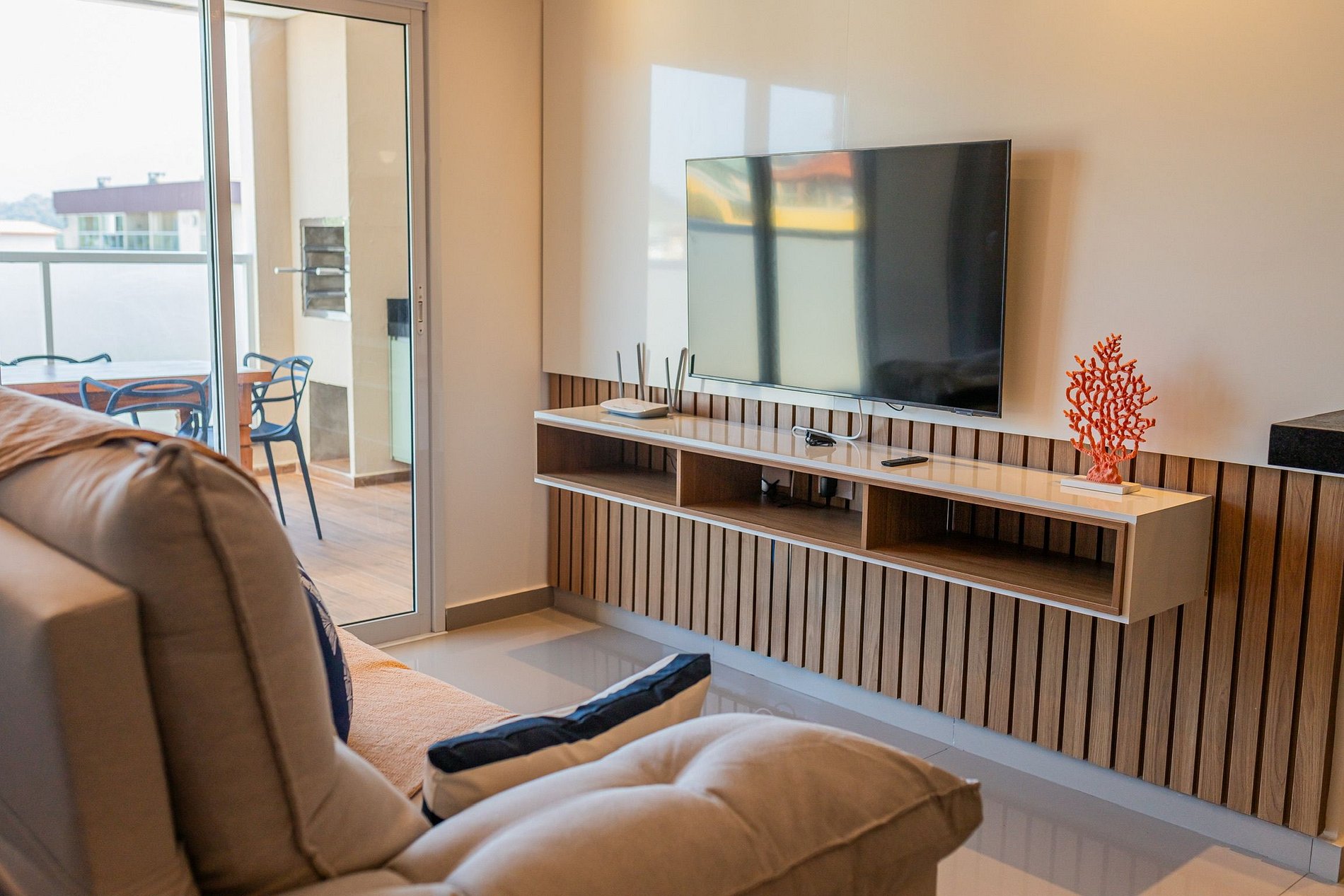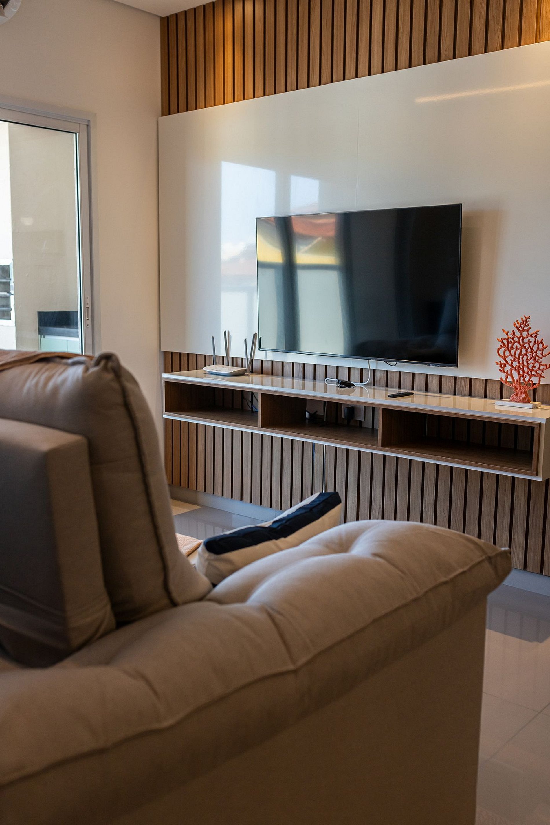 A sala com um sofá espaçoso e uma Smartv 50 Samsung.