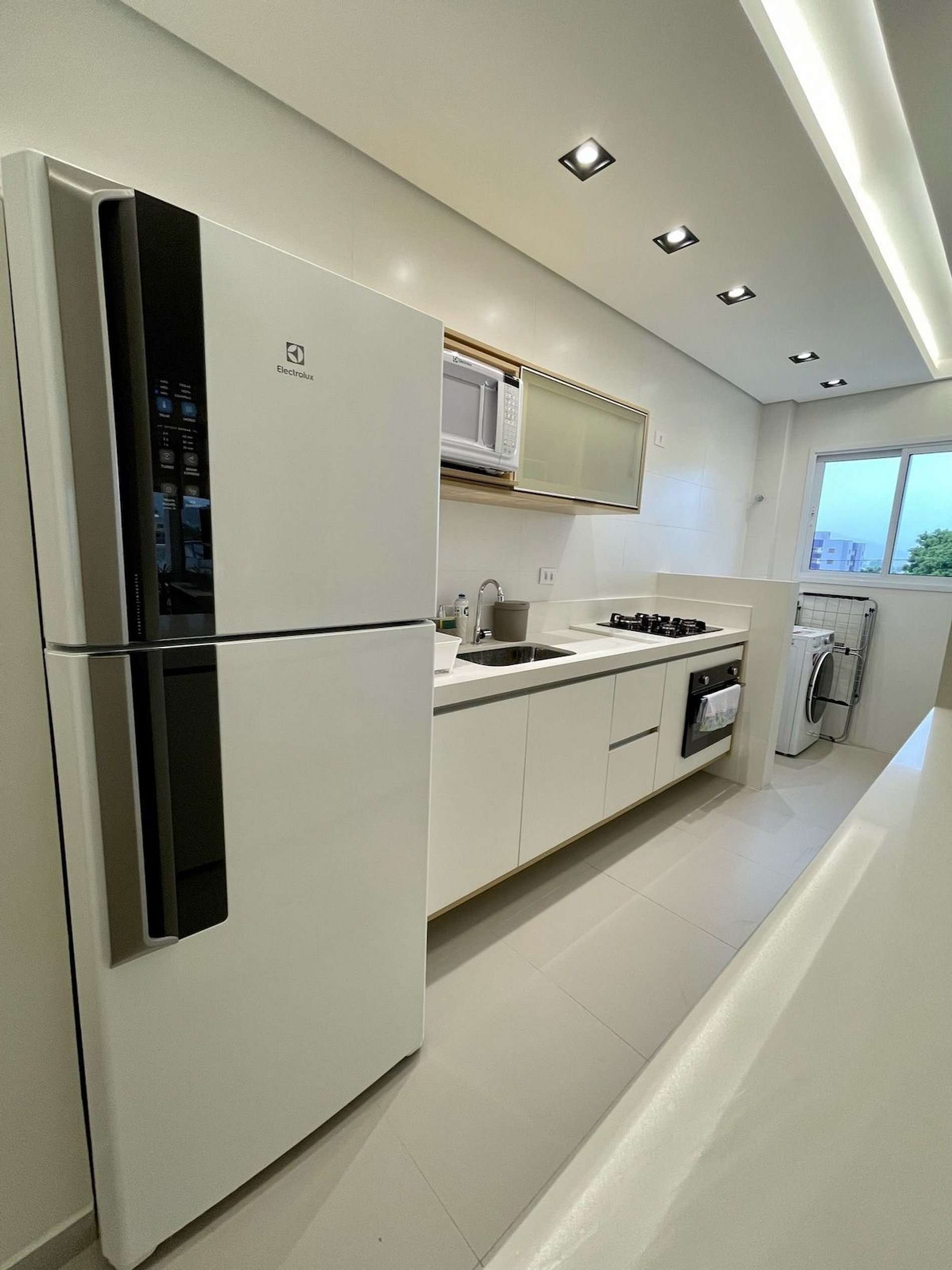 Cozinha totalmente equipada com cooktop e forno elétrico, geladeira, microondas, liquidificador, sanduicheira; Internet fibra óptica de 400mb