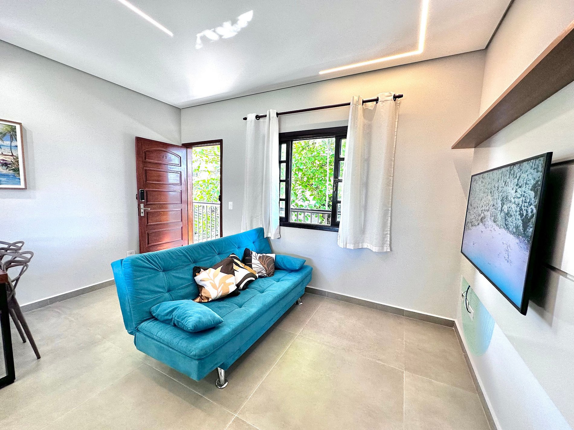 A sala com um sofá espaçoso e uma Smartv 50 com Wi-Fi