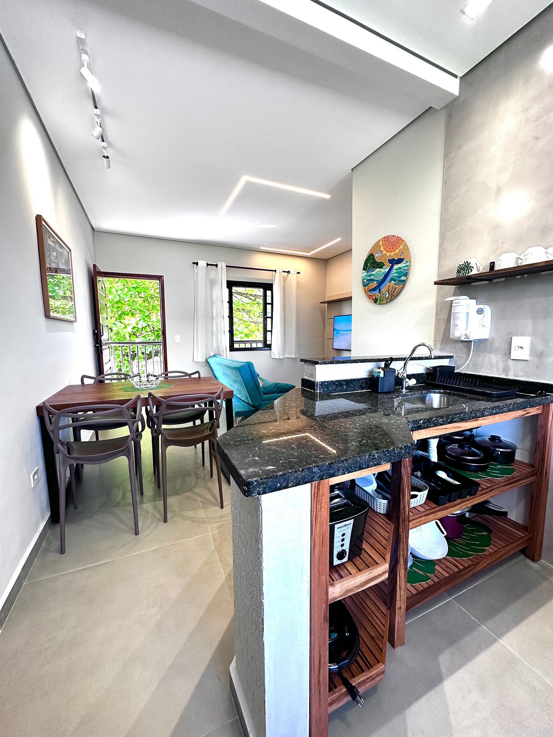 Cozinha totalmente equipada com fogão, geladeira, microondas, liquidificador, sanduicheira; cafeteira