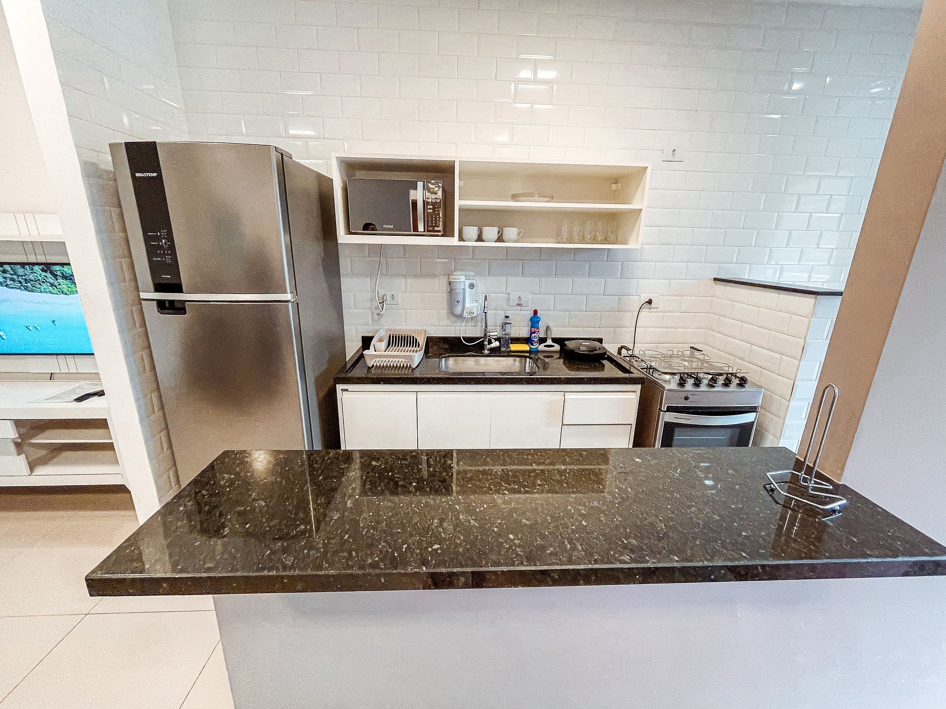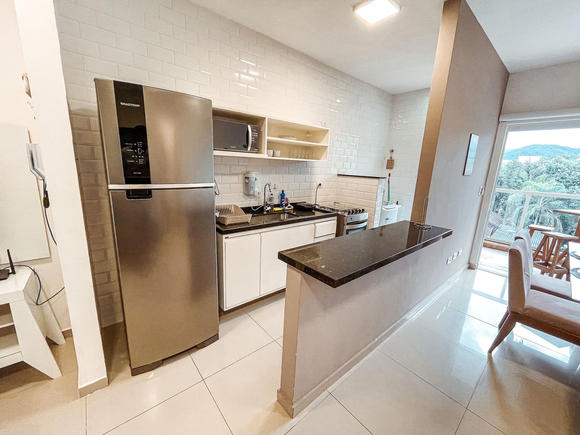 Cozinha totalmente equipada com fogão, geladeira, microondas, liquidificador, sanduicheira;