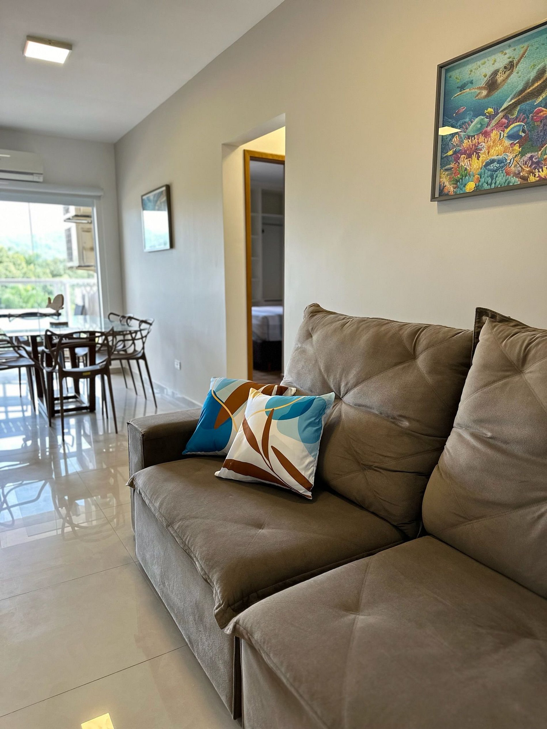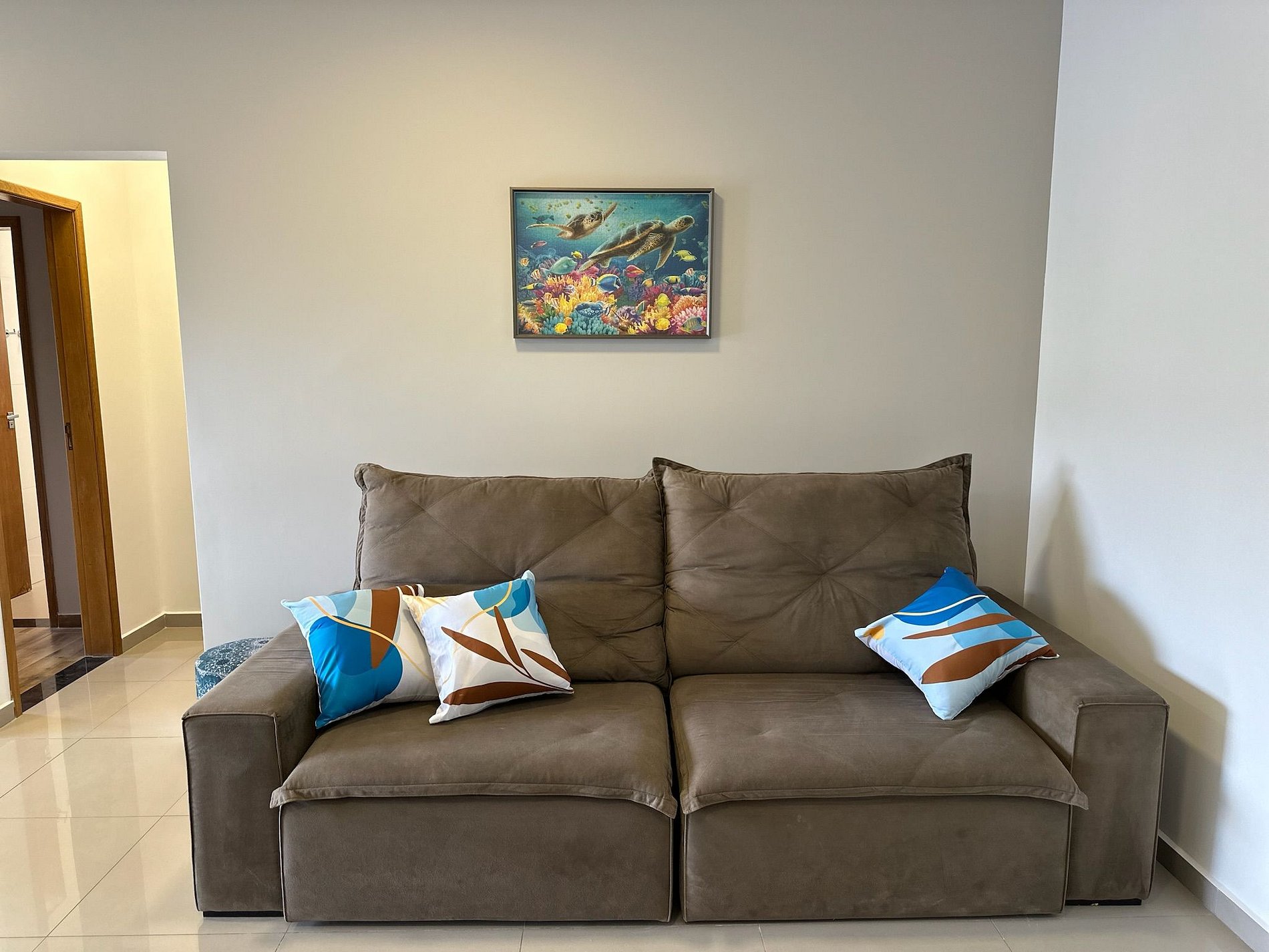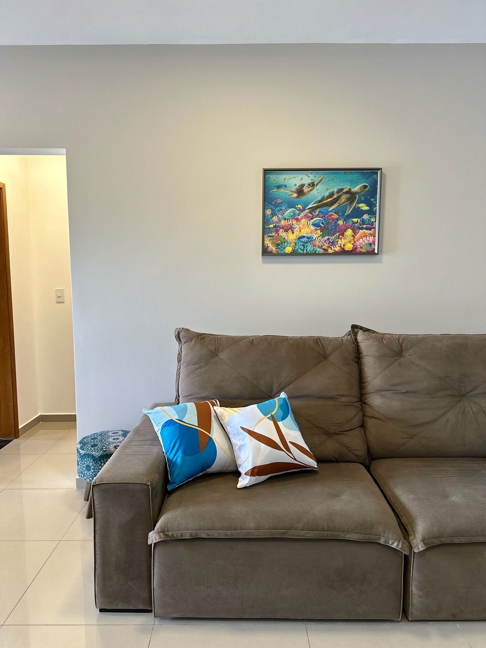 A sala com um sofá espaçoso e uma Smartv 50