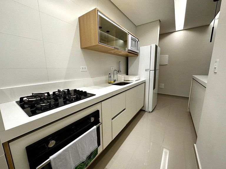 Cozinha totalmente equipada com fogão, geladeira, microondas etc