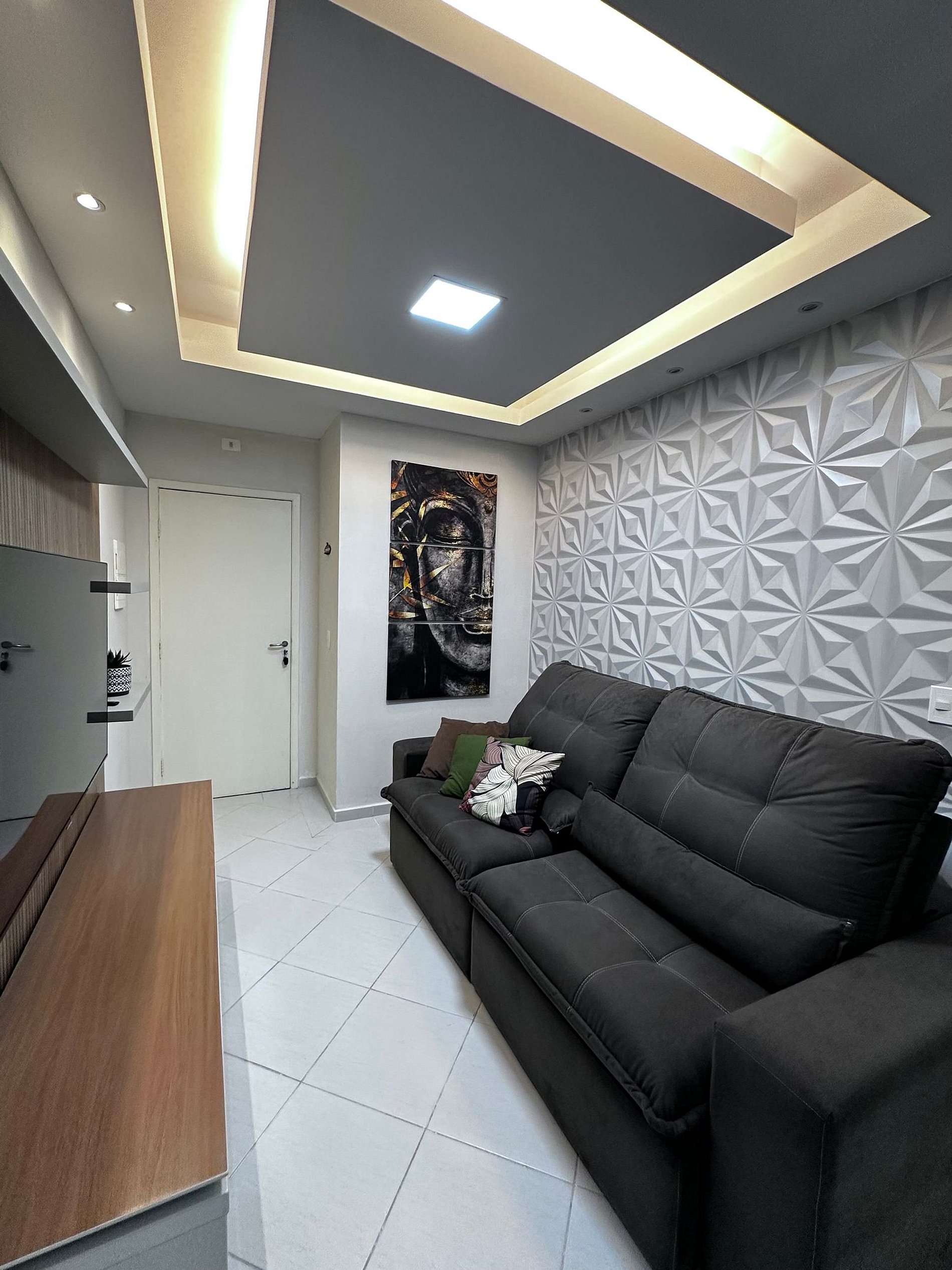 A sala com um sofá espaçoso e uma Smartv 50 Samsung.