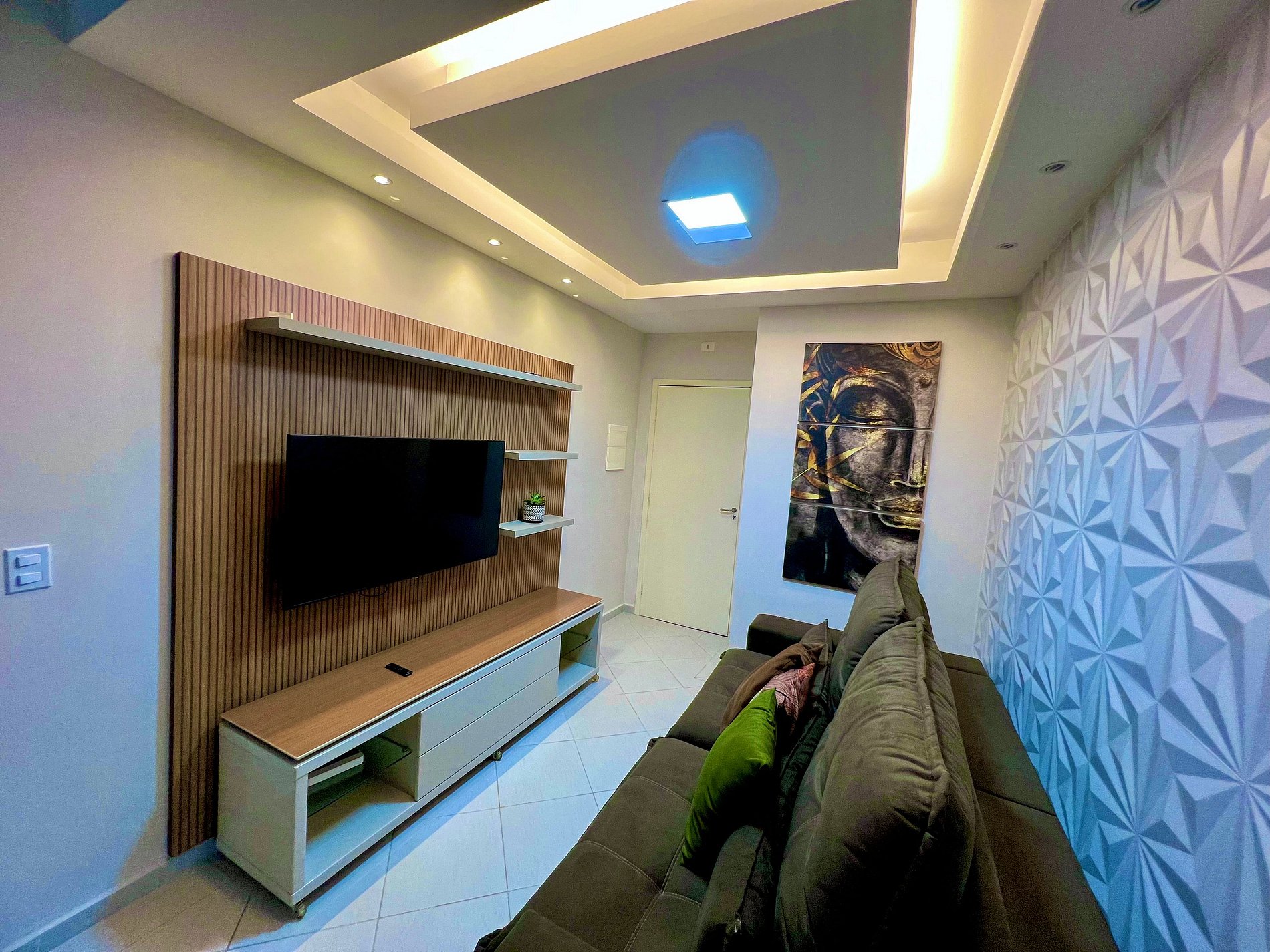 A sala com um sofá espaçoso e uma Smartv 50 Samsung.