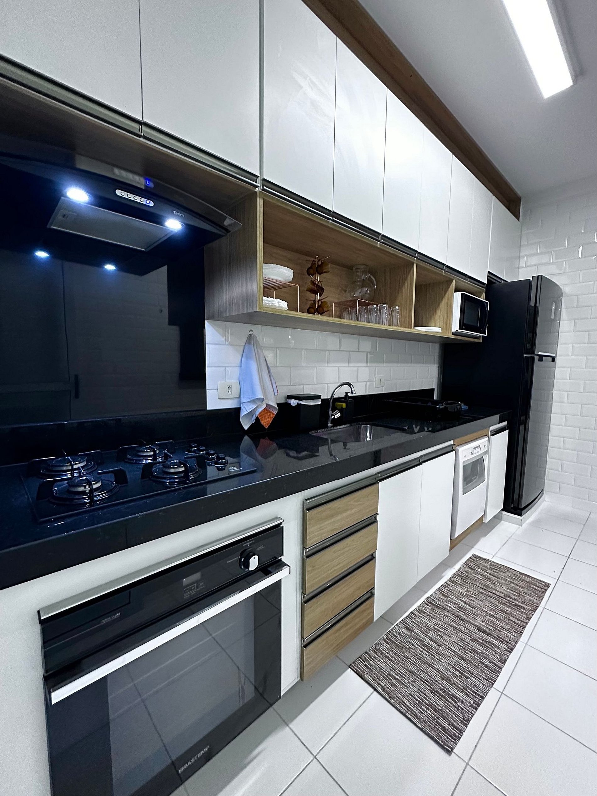 Cozinha totalmente equipada com cooktop e forno elétrico, geladeira, microondas, liquidificador, sanduicheira; lava louças.